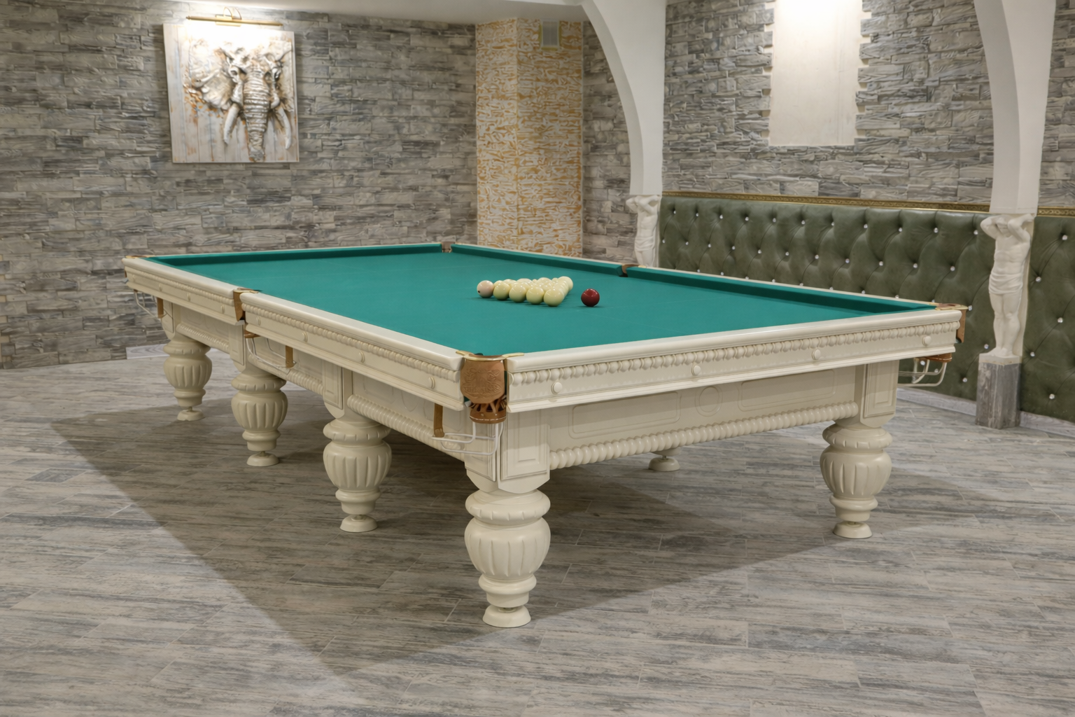 • Игровое поле из ардезии. Натуральная сланцевая плита обеспечивает идеальную ровность, стабильность и точную раскатку шаров, что является стандартом для профессиональных бильярдных столов. Ардезия устойчива к деформациям и рассчитана на многолетнюю интенсивную эксплуатацию.
