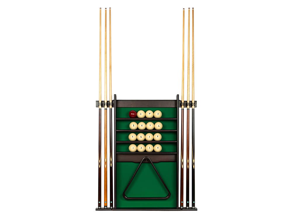 Киевница обеспечивает надежное вертикальное хранение, предохраняя кии от деформации и повреждений. Верхние фиксаторы удерживают их на месте, а нижние посадочные отверстия гарантируют устойчивость и удобство в использовании.