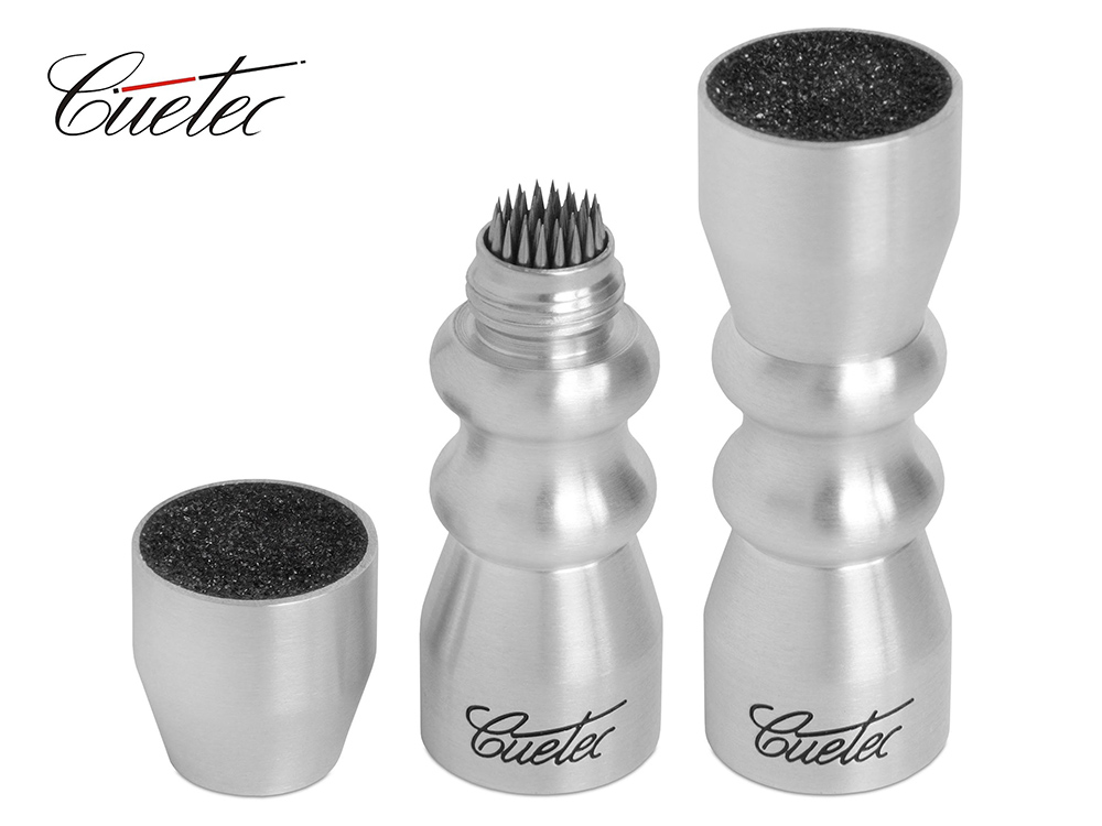 Инструмент 3в1 от знаменитой компании Cuetec, известной в первую очередь своими инновациями в бильярде. Сделан из аллюминия, используемого в самолетостроении, что гарантирует рекордную долговечность. Объединяет в себе махровку и две точилки с разными радиусами сферы для полного контроля наклейки.