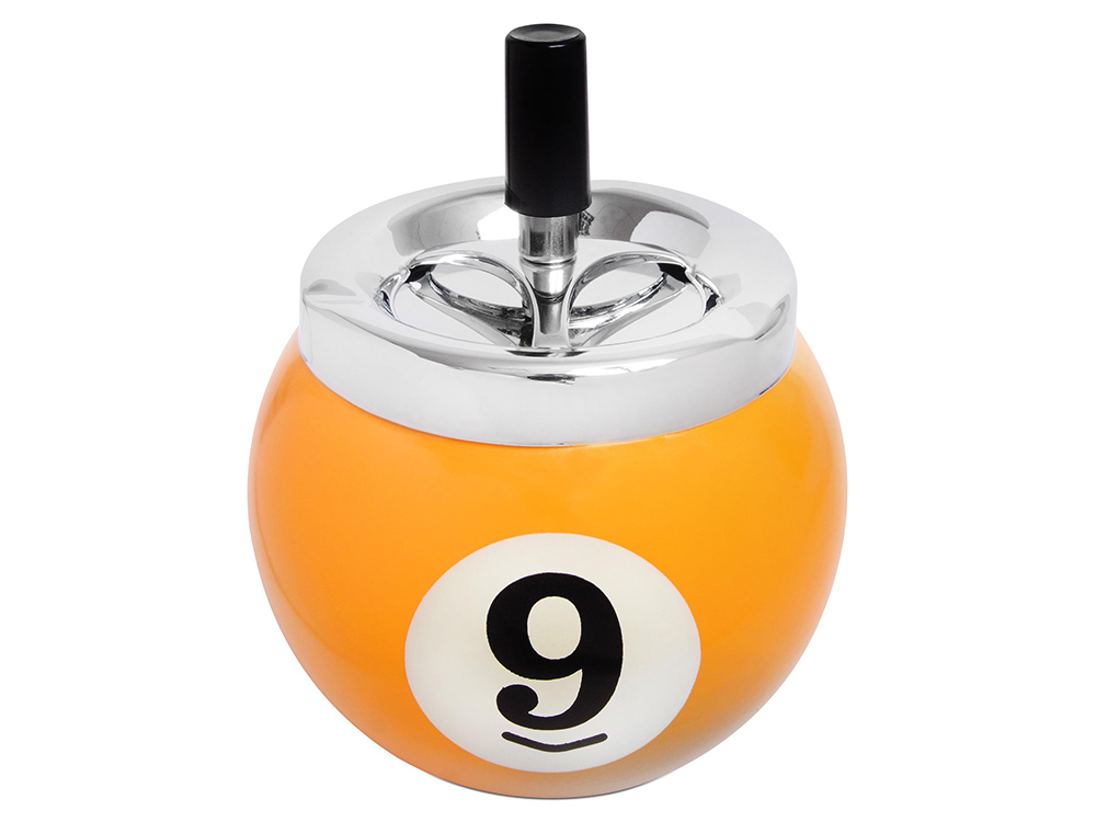 Пепельница «Бильярдный шар №9» изготовлена в виде желтого шара №9 для пула с серебристой крышкой. Крышка снабжена удобной ручкой при нажатии на которую пепел сбрасывается внутрь пепельницы. Благодаря крышке пепельница препятствует распространению запаха пепла в воздух помещения.