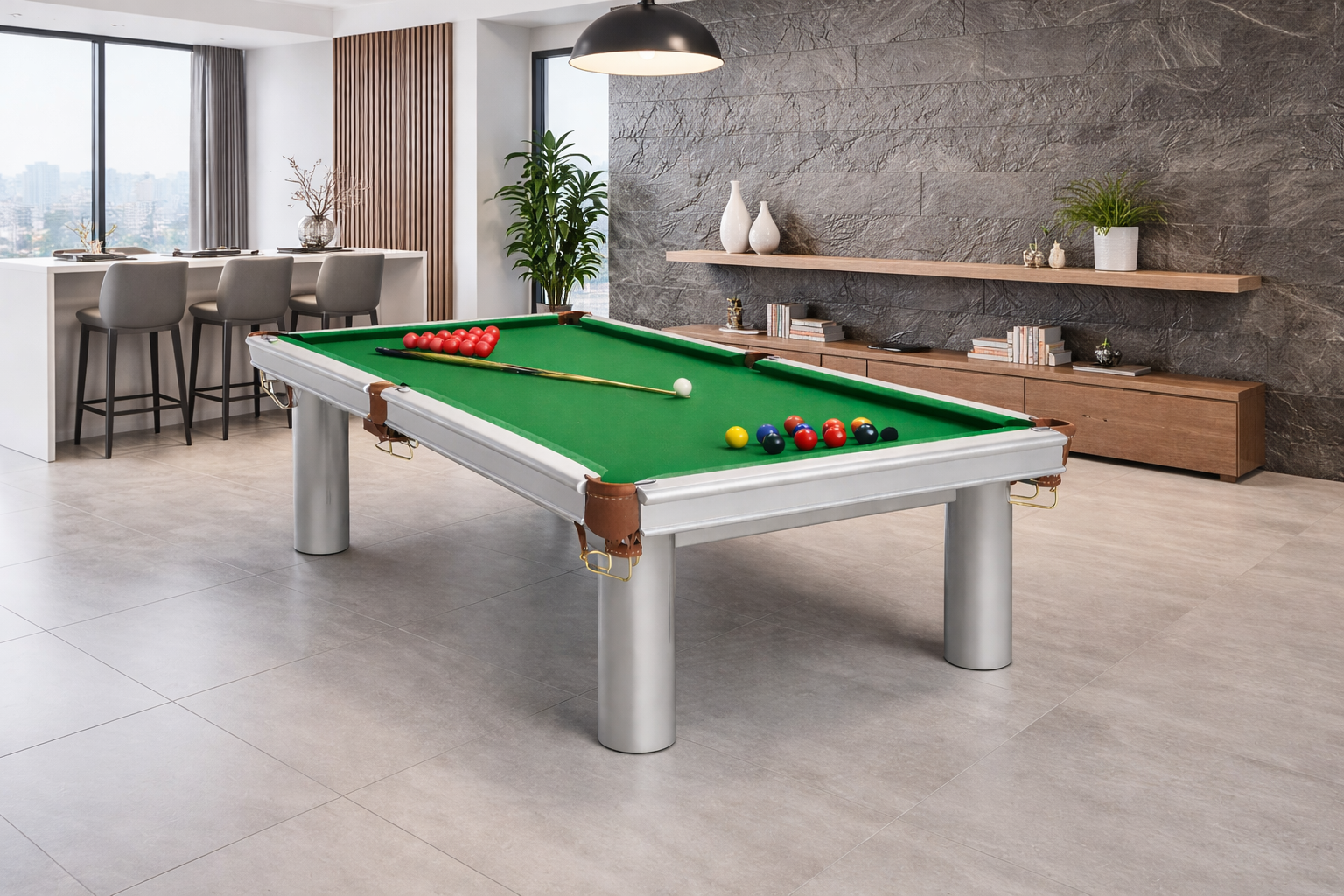 • Професійний клас для пулу. Стіл оснащений ігровим полем із натуральної ардезії та професійною бортовою гумою, оптимізованою для гри в пул, що забезпечує точний розкат і стабільний відскок куль.