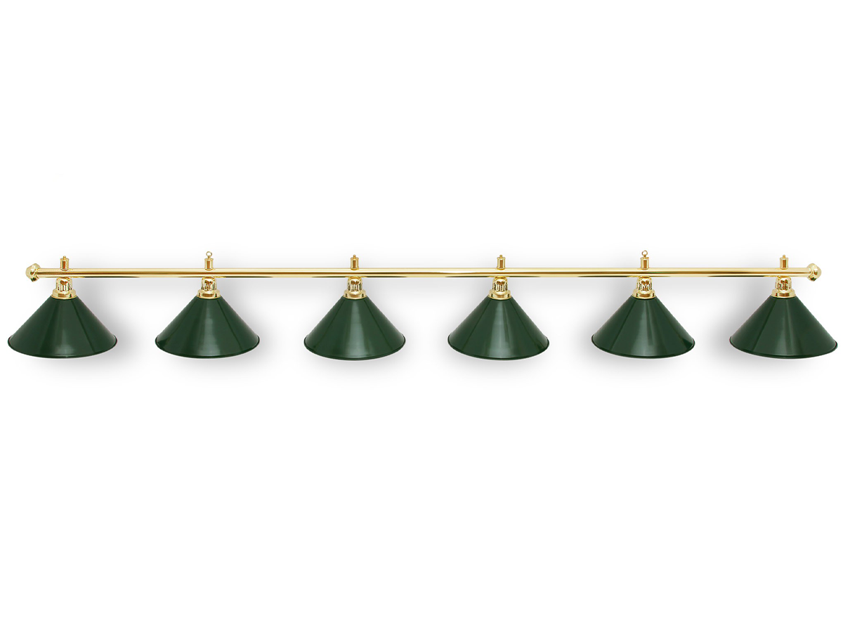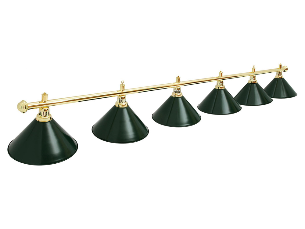 Світильник більярдний Evergreen (6 плафонів) — класична освітлювальна система, спеціально розроблена для рівномірного освітлення великого більярдного столу. Шість плафонів створюють потужне і спрямоване світло по всій ігровій поверхні, дозволяючи чітко бачити розташування куль і комфортно контролювати гру.Світильник забезпечує правильне освітлення ігрового поля, що особливо важливо для професійної та точної гри в більярд. Завдяки класичному дизайну із зеленими металевими плафонами модель Evergreen чудово підходить як для більярдних клубів, так і для домашніх більярдних кімнат і ігрових зон.